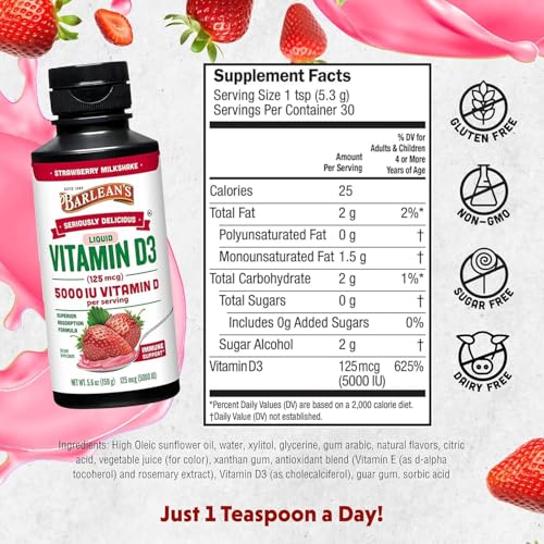 - POWERFUL IMMUNE SUPPORT: Help support immunity and healthy energy levels with a smooth, creamy Strawberry Milkshake taste that kids and adults will love with our Vitamin D3 liquid supplements. Barlean's Seriously Delicious Vitamin D3 features 5000 IU (125 mcg) of Vitamin D3 per serving, and may support cognitive health, focus, and a balanced mood. Gluten free, dairy free, non-GMO, and kosher
