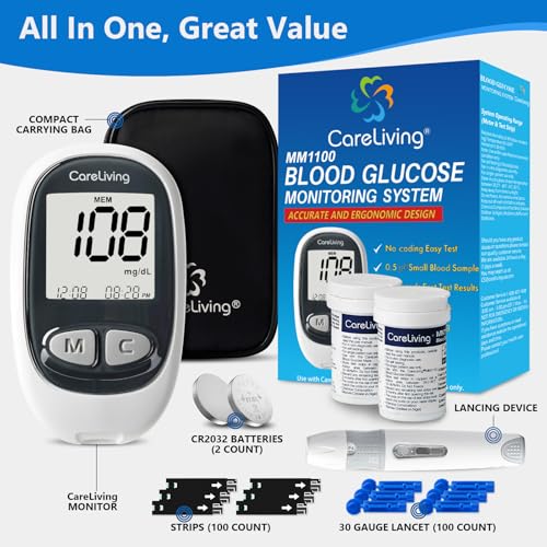 CareLiving MM1100 Blood Glucose Monitor Kit with 100 Test Strips, 100 Lancets, 1 Blood Glucose Meter, 1 Lancing Device, Diabetes Testing Kit, Portable Blood Sugar Test Kit, Glucometer Kit for Home