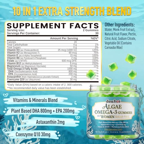 duwhot Vegan Omega-3 Gummies for Women, Algae DHA & EPA 1000mg, with CoQ10, Astaxanthin, Fish Oil Supplement Alternative for Adults, Heart & Brain Health, 60 Count