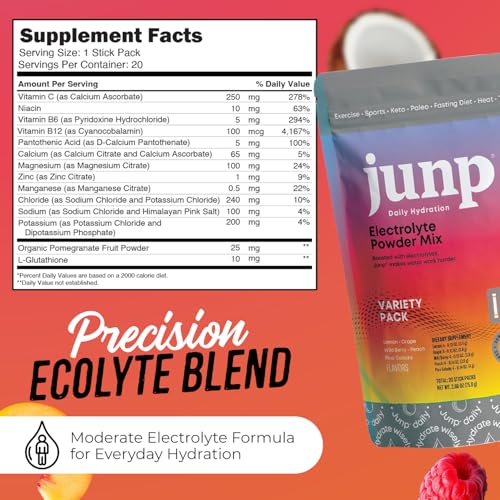 - MAKE WATER WORK HARDER: Junp’s electrolytes packets boost water with natural salty electrolytes and refreshing fruit-infused flavor. Replenish sodium, potassium & magnesium lost through sweat with our zero sugar electrolyte powder hydration packets sugar free. Single-serve stick packs for gym, travel, and on-the-go daily hydration.