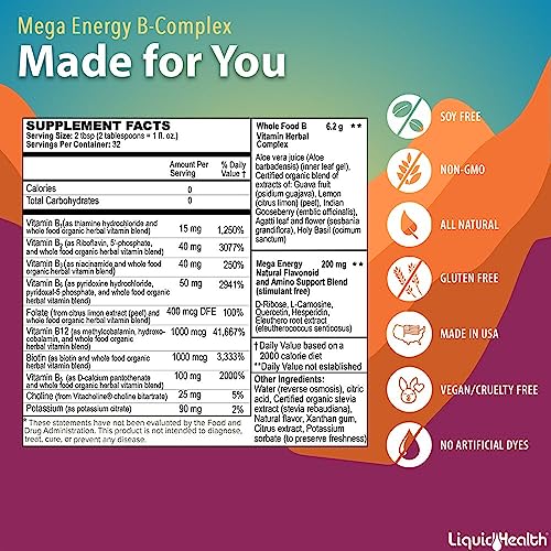 - GET A MEGA ENERGY BOOST & BALANCED B VITAMIN LEVELS: Liquid Health's USA Made Mega Energy B-Complex contains 10 essential energy-boosting vitamins including B-vitamins, Folate, Biotin, Choline, Niacin, Pantothenic Acid, and more. This unique multivitamin helps boost energy naturally, supports your heart, gut health, immune system, and the added electrolytes help boost athletic performance and functions.