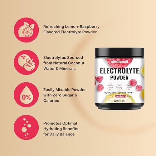 Naturebell Electrolytes Powder No Sugar, 500g (76 Servings) | Keto Fast Hydration Formula | 1,000mg Potassium + Trace Minerals & Coconut Water | Raspberry Lemonade Flavor | Carnivore Friendly