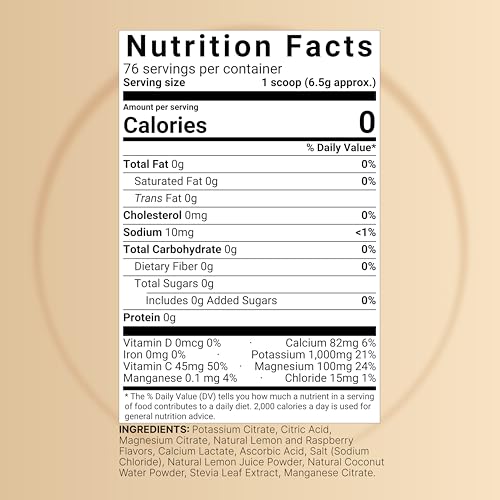• Refreshing lemon and raspberry flavored electrolyte powder, sourced naturally from coconut water and essential minerals, 500g supply (1.1 pound), 76 servings