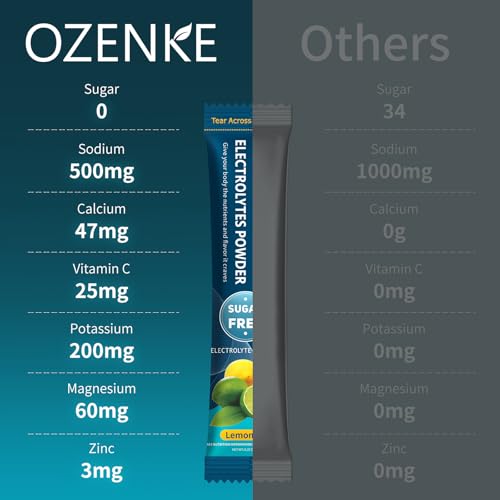 • Quick Hydration: OZENKE electrolyte powder packets have a professional formula that helps to replenish lost water and electrolytes in our body quickly. It contains essential electrolytes like Potassium, Sodium, Magnesium, Zinc, and Calcium, which help maintain osmotic pressure of intracellular and extracellular fluids. Prevent dehydration due to exercise with ease!