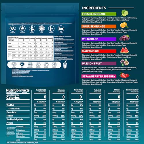 • Perfect Hydration Set: 30 Sticks electrolytes powder no sugar, total 6 flavors, 5 sticks per flavor including: lemonade, watermelon, orange, grape, passion fruit, strawberry & raspberry. Sugar free and gluten free, perfect for vegan and fasting. electrolyte powder for hydration and health, with pure natural organic fruits, Sodium, Vitamin C, Potassium, Magnesium, Zinc, Vitamin D, lron, Calcium.