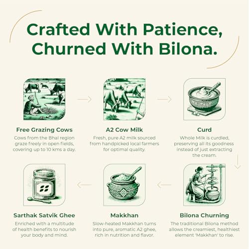 • Trust In Our Ancient Churning Method: We believe in making ghee using our traditional bilona churning method with a conventional twist. Using our in-house developed tech-aided bilona, we carefully churn whole milk curd. It involves churning in both clockwise & anti-clockwise that too without any human interaction to maintain hygiene and purity.