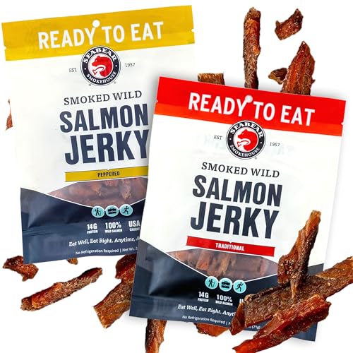 "Classic Flavor Combo - Our Traditional take on smoked salmon jerky offers a deep, smoky flavor without spice. Our Peppered Jerky is coated in coarse black pepper that adds a bold, spicy edge to the deep, smoky flavor of the salmon—ideal for fans of savory heat and layered taste. "