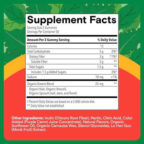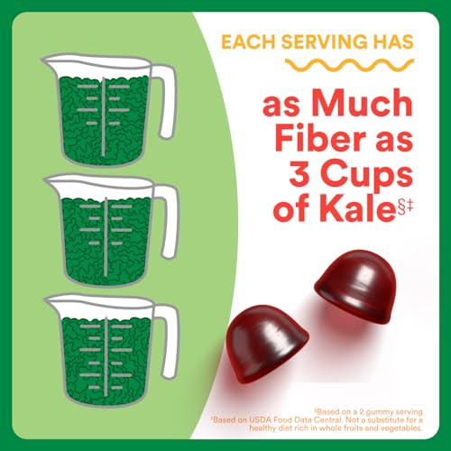 - SAME AMOUNT OF FIBER AS 3 CUPS OF KALE**: US children meet only 45% of the daily value for fiber.** Each gummy serving contains the same amount of fiber as 3 cups of kale** so your child gets more of what they need to maintain regular digestion*