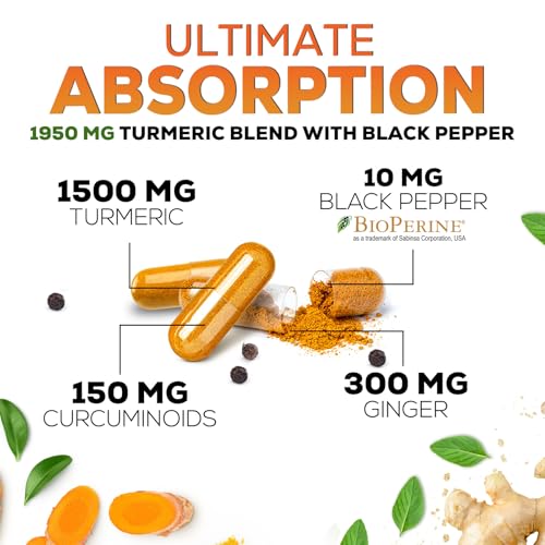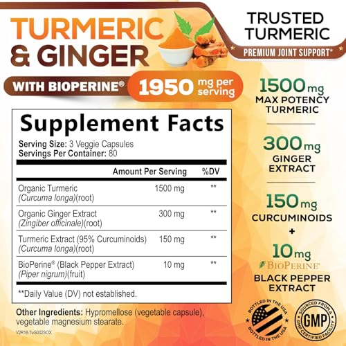 Turmeric Curcumin Supplement 1950mg - 95% Curcuminoids with Organic Turmeric & Ginger, BioPerine Black Pepper for Best Absorption, Nature's Vegan Joint Support, Non-GMO, Bottled in USA - 240 Capsules